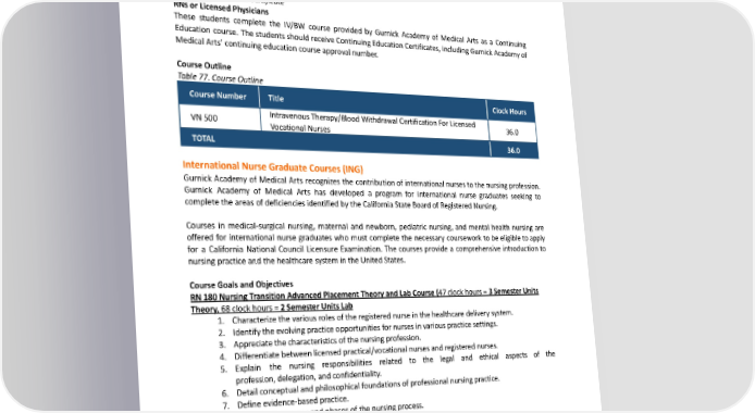 Non-LicensedVNs Senior students in good academic standing may also complete the course. However, once senior students complete the course, their Certificate of Completion will not be forwarded to BVNPT until they receive their license. Upon receipt of licensure, the student must contact Gurnick Academy of Medical Arts and request submissionoftherequiredcertificate to the Board. Continuing Education Certificate RNsorLicensedPhysicians These students complete the IV/BW course provided by Gurnick Academy of Medical Arts as a Continuing Education course. The students should receive Continuing Education Certificates, including Gurnick Academy of MedicalArts’ continuing education course approval number. CourseOutline Table 77. Course Outline CourseNumber Title Clock Hours Intravenous Therapy/Blood Withdrawal Certification For Licensed VN500 36.0 Vocational Nurses TOTAL 36.0 International Nurse Graduate Courses (ING) Gurnick Academy of Medical Arts recognizes the contribution of international nurses to the nursing profession. Gurnick Academy of Medical Arts has developed a program for international nurse graduates seeking to completetheareasofdeficienciesidentified by the California State Board of Registered Nursing. Courses in medical-surgical nursing, maternal and newborn, pediatric nursing, and mental health nursing are offered for international nurse graduates who must complete the necessary coursework to be eligible to apply for a California National Council Licensure Examination. The courses provide a comprehensive introduction to nursing practice and the healthcare system in the United States. CourseGoalsandObjectives RN180NursingTransitionAdvancedPlacementTheoryandLabCourse(47clockhours= 3SemesterUnits Theory, 68 clock hours = 2 Semester Units Lab 1. Characterize the various roles of the registered nurse in the healthcare delivery system. 2. Identify the evolving practice opportunities for nurses in various practice settings. 3. Appreciate the characteristics of the nursing profession. 4. Differentiate between licensed practical/vocational nurses and registered nurses. 5. Explain the nursing responsibilities related to the legal and ethical aspects of the profession, delegation, and confidentiality. 6. Detail conceptual and philosophical foundations of professional nursing practice. 7. Define evidence-based practice. 8. Explain the purpose and phases of the nursing process. 9. Specify clinical judgment in nursing practice. 10. Examinefactors creating successful or unsuccessful communication. 11. Evaluate helpful and unhelpful communication techniques. 12. Identify key aspects of collaboration. Skills Lab 240