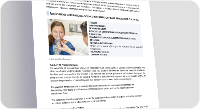addition, the program prepares students to take their RCDS examinations. An Associate of Occupational Science Degree in Cardiac Ultrasound Technology is awarded upon program completion. The normal completion time for this program is seventy-two (72) weeks, excluding any holiday and vacation times. Class times can and may be rescheduled on an alternate day of the week (i.e., Sunday through Saturday) to ensure program completion is on time and the required program hours are fulfilled. Voluntary and Prudent Use Statement for Ultrasound Technology Instructions in the ultrasound training laboratory are made possible by the participation of students, both as the person scanning and the person being scanned (subject). All the exercises are developed to ensure prudent and safe use of the equipment and the subject. Participation is voluntary. Election not to participate will not affect grades. However, alternate training will need to be arranged. ASSOCIATEOFOCCUPATIONALSCIENCEINRESPIRATORYCAREPROGRAM(A.O.S.INRC) 75WEEKS 1446CLOCKHOURS 64SEMESTERUNITS ASSOCIATEOFOCCUPATIONALSCIENCEDEGREEPROGRAM, 5SEMESTERS STANDARDOCCUPATIONALCLASSIFICATION(SOCCode): 29-1126.00 POTENTIALOCCUPATIONS: Please see a school official for the complete list of potential occupations. LOCATIONS:Modesto DELIVERY:Blended AstockphotofromCanva.com. A.O.S. in RC Program Mission The Associate of Occupational Science in Respiratory Care (A.O.S. in RC) at Gurnick Academy of Medical Arts aims to educate undergraduate respiratory care (RC) students to meet the healthcare needs of individuals, families, and communities. Our mission is to motivate and provide guidance to each student throughout the program and prepare them to be valuable members of the allied health system. We strive to instill a sense of pride in the profession of respiratory care that will carry forth to every patient they encounter. Theprogramemphasizestheknowledgeandskillsappropriateforexaminationsrequiredbythe Respiratory Care Board of California and other regulatory bodies, such as the National Board for Respiratory Care. Theextensiveclinical preparation is under the supervision of respiratory therapists. Instruction occurs on anonlineplatform,inthelaboratory,andinclinical settings. A.O.S. in RC Program Description This program prepares graduates to pursue entry-level employment or jobs in related fields. The goal of this program is to prepare graduates with demonstrated competence in the cognitive (knowledge), psychomotor (skills), and affective (behavior) learning domains of respiratory care practice as performed by registered respiratory therapists (RRTs). A.O.S. in RC Program Goals and Objectives ● Provide a high-quality educational experience to each student desiring to enter the respiratory care profession. 174