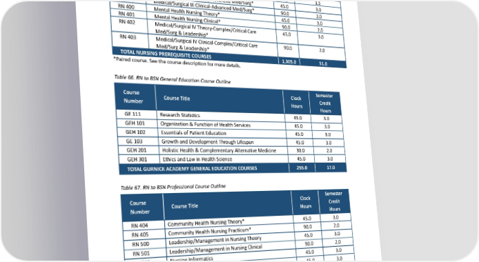 RN202 Medical/Surgical II Theory-Intermediate Med/Surg* 45.0 3.0 RN203 Medical/Surgical II Clinical-Intermediate Med/Surg* 90.0 2.0 RN300 MaternalNewbornTheory* 45.0 3.0 RN301 MaternalNewbornClinical* 67.5 1.5 RN302 CareofChildrenTheory* 45.0 3.0 RN303 CareofChildrenClinical* 67.5 1.5 RN304 Medical/Surgical III Theory-Advanced Med/Surg* 45.0 3.0 RN305 Medical/Surgical III Clinical-Advanced Med/Surg* 90.0 2.0 RN400 MentalHealthNursingTheory* 45.0 3.0 RN401 MentalHealthNursingClinical* 90.0 2.0 RN402 Medical/Surgical IV Theory-Complex/Critical Care 45.0 3.0 Med/Surg&Leadership* RN403 Medical/Surgical IV Clinical-Complex/Critical Care 90.0 2.0 Med/Surg&Leadership* TOTALNURSINGPREREQUISITECOURSES 1,305.0 51.0 *Paired course. See the course description for more details. Table 66. RN to BSN General Education Course Outline Semester Course Clock CourseTitle Credit Number Hours Hours GE111 ResearchStatistics 45.0 3.0 GEH101 Organization & Function of Health Services 45.0 3.0 GEH102 Essentials of Patient Education 45.0 3.0 GE103 GrowthandDevelopmentThroughLifespan 45.0 3.0 GEH201 Holistic Health & Complementary Alternative Medicine 30.0 2.0 GEH301 Ethics and Law in Health Science 45.0 3.0 TOTALGURNICKACADEMYGENERALEDUCATIONCOURSES 255.0 17.0 Table 67. RN to BSN Professional Course Outline Semester Course Clock CourseTitle Credit Number Hours Hours RN404 CommunityHealthNursingTheory* 45.0 3.0 RN405 CommunityHealthNursingPracticum* 90.0 2.0 RN500 Leadership/ManagementinNursingTheory 45.0 3.0 RN501 Leadership/ManagementinNursingClinical 90.0 2.0 RN502 Nursing Informatics 45.0 3.0 RN504 Nursing Research Theory 45.0 3.0 RN505 Bachelors AchievementCapstonePortfolio 45.0 3.0 TOTALGURNICKACADEMYPROFESSIONALCOURSES 405.0 19.0 TOTALPROGRAMFORDEGREE(PrerequisitesplusProfessional) 2,505.0 120.0 *Paired course. See the course description for more details. 215