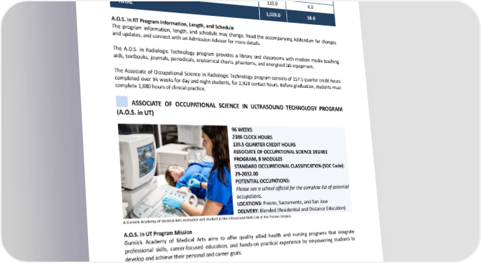 Integration of Theory and Practice 25.0 2.0 XRT106 Fundamentals Clinical Practice I 160.0 5.0 XRT107 Clinical Practice II 160.0 5.0 XRT108 Clinical Practice III 160.0 5.0 XRT109 Clinical Practice IV 120.0 4.0 XRT110 TOTAL 1,028.0 58.0 A.O.S. in RT Program Information, Length, and Schedule The program information, length, and schedule may change. Read the accompanying Addendum for changes andupdates,andconnectwithanAdmissionAdvisorformoredetails. The A.O.S. in Radiologic Technology program provides a library and classrooms with modern media teaching aids, textbooks, journals, periodicals, anatomical charts, phantoms, and energized lab equipment. The Associate of Occupational Science in Radiologic Technology program consists of 157.5 quarter credit hours completed over 94weeksfordayandnightstudents,for2,923contacthours.Beforegraduation,studentsmust complete1,880hoursofclinicalpractice. ASSOCIATE OF OCCUPATIONAL SCIENCE IN ULTRASOUND TECHNOLOGY PROGRAM (A.O.S. in UT) 96WEEKS 2386CLOCKHOURS 139.5QUARTERCREDITHOURS ASSOCIATEOFOCCUPATIONALSCIENCEDEGREE PROGRAM,8MODULES STANDARDOCCUPATIONALCLASSIFICATION(SOCCode): 29-2032.00 POTENTIALOCCUPATIONS: Please see a school official for the complete list of potential occupations. LOCATIONS:Fresno,Sacramento,andSanJose DELIVERY:Blended(ResidentialandDistanceEducation) AGurnickAcademyofMedicalArtsinstructorandstudentintheUltrasoundSkillsLabattheFresnocampus. A.O.S. in UT Program Mission Gurnick Academy of Medical Arts aims to offer quality allied health and nursing programs that integrate professional skills, career-focused education, and hands-on practical experience by empowering students to developandachievetheirpersonalandcareergoals. A.O.S. in UT Program Description The A.O.S. in Ultrasound Technology program’s minimum expectations are to prepare competent entry-level sonographers in the cognitive (knowledge), psychomotor (skills), and affective (behavior) learning domains. Graduatesmayworkinhospitals,imagingcenters,physicians’offices,orclinics. A.O.S. in UT Program Goals and Objectives Diagnostic Medical Sonography (DMS) requires providing diagnostic sonographic images and possessing critical 180