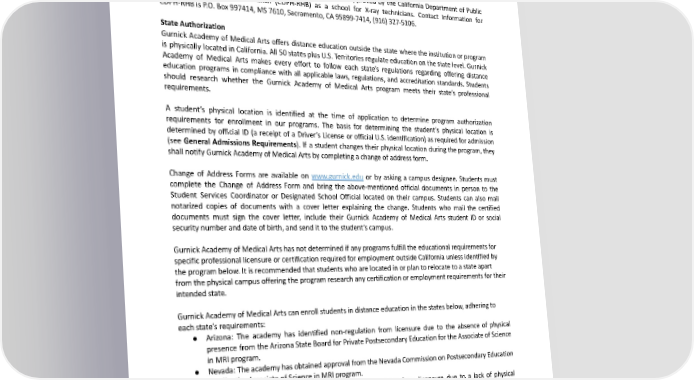 Vocational Nurse Program The Vocational Nurse Program is approved by the Board of Vocational Nursing and Psychiatric Technicians (BVNPT). The Board of Vocational Nursing and Psychiatric Technicians’ contact information is 2535 Capitol Oaks Drive, Suite 205, Sacramento, CA 95833, Phone: (916) 263-7800. X-ray Technician with Medical Assistant Skills Program The X-ray Technician with Medical Assistant Skills Program is approved by the California Department of Public Health, Radiologic Health Branch (CDPH-RHB) as a school for X-ray technicians. Contact Information for CDPH-RHBisP.O.Box997414,MS7610,Sacramento,CA95899-7414,(916)327-5106. State Authorization Gurnick Academy of Medical Arts offers distance education outside the state where the institution or program is physically located in California. All 50 states plus U.S. Territories regulate education on the state level. Gurnick Academy of Medical Arts makes every effort to follow each state’s regulations regarding offering distance education programs in compliance with all applicable laws, regulations, and accreditation standards. Students should research whether the Gurnick Academy of Medical Arts program meets their state’s professional requirements. A student’s physical location is identified at the time of application to determine program authorization requirements for enrollment in our programs. The basis for determining the student’s physical location is determined by official ID (a receipt of a Driver’s License or official U.S. identification) as required for admission (see General Admissions Requirements). If a student changes their physical location during the program, they shall notify Gurnick Academy of Medical Arts by completing a change of address form. Change of Address Forms are available on www.gurnick.edu or by asking a campus designee. Students must complete the Change of Address Form and bring the above-mentioned official documents in person to the Student Services Coordinator or Designated School Official located on their campus. Students can also mail notarized copies of documents with a cover letter explaining the change. Students who mail the certified documents must sign the cover letter, include their Gurnick Academy of Medical Arts student ID or social security number and date of birth, and send it to the student’s campus. Gurnick AcademyofMedicalArtshasnotdeterminedifanyprogramsfulfilltheeducationalrequirementsfor specific professional licensure or certification required for employment outside California unless identified by theprogrambelow.Itisrecommendedthatstudentswhoarelocatedinorplantorelocatetoastateapart fromthephysicalcampusofferingtheprogramresearchanycertificationoremploymentrequirementsfortheir intendedstate. Gurnick AcademyofMedicalArtscanenrollstudentsindistanceeducationinthestatesbelow,adheringto eachstate’s requirements: ● Arizona: The academy has identified non-regulation from licensure due to the absence of physical presence from the Arizona State Board for Private Postsecondary Education for the Associate of Science in MRI program. ● Nevada:TheacademyhasobtainedapprovalfromtheNevadaCommissiononPostsecondaryEducation to offer the Associate of Science in MRI program. ● Florida: The academy has been notified of non-regulation from licensure due to a lack of physical presence from the Florida Commission for Independent Education for the Associate of Science in MRI program. OtherApprovalsandMemberships ● The US Department of Education approves Gurnick Academy of Medical Arts to participate in Title IV/Federal Financial Aid programs. 21