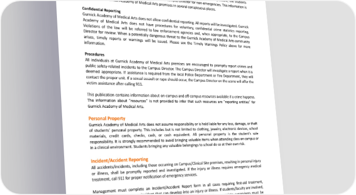 CrimeReporting Prompt reporting will ensure timely warning notices on campus and timely disclosure of crime statistics. Gurnick Academy of Medical Arts does not have campus police. All crime victims and witnesses are strongly encouraged to report the crime immediately. If a crime or other emergency occurs, students are instructed to notify any staff/faculty member of Gurnick Academy of Medical Arts, including the Security personnel if applicable. They will place the 911 call. If the nature of the emergency makes this impossible, the students should call 911 themselves. Contact the appropriate Campus Director for non-emergencies. This information is postedontheGurnickAcademyofMedicalArtspremisesinseveralconspicuousplaces. Confidential Reporting Gurnick AcademyofMedicalArtsdoesnotallowconfidentialreporting.Allreportswillbeinvestigated.Gurnick Academy of Medical Arts does not have procedures for voluntary, confidential crime statistics reporting. Violations of the law will be referred to law enforcement agencies and, when appropriate, to the Campus Director for review. When a potentially dangerous threat to the Gurnick Academy of Medical Arts community arises, timely reports or warnings will be issued. Please see the Timely Warnings Policy above for more information. Procedures All individuals at Gurnick Academy of Medical Arts premises are encouraged to promptly report crimes and public safety-related incidents to the Campus Director. The Campus Director will investigate a report when it is deemed appropriate. If assistance is required from the local Police Department or Fire Department, they will contact the proper unit. If a sexual assault or rape should occur, the Campus Director on the scene will offer the victim assistance after calling 911. This publication contains information about on-campus and off-campus resources available if a crime happens. The information about “resources” is not provided to infer that such resources are “reporting entities” for Gurnick AcademyofMedicalArts. Personal Property Gurnick Academy of Medical Arts does not assume responsibility or is held liable for any loss, damage, or theft of students’ personal property. This includes but is not limited to clothing, jewelry, electronic devices, school materials, credit cards, checks, cash, or cash equivalent. All personal property is the student’s sole responsibility. It is strongly recommended to avoid bringing valuable items when attending class on campus or in a clinical environment. Students bringing any valuable belongings to school do so at their own risk. Incident/Accident Reporting All accidents/incidents, including those occurring on Campus/Clinical Site premises, resulting in personal injury or illness, shall be promptly reported and investigated. If the injury or illness requires emergency medical treatment, call 911 for proper notification of emergency services. Management must complete an Incident/Accident Report form in all cases requiring first-aid treatment, emergency services, or any incident that can develop into an injury or illness. If students/faculty are involved, their Program Coordinator should be notified. If staff is involved, their appropriate supervisors must be notified. In all cases, Campus Directors and management must be notified whenever an Incident/Accident Reportformiscompleted.Thesereportsarethenfiledintherespectiveindividual’sphysicalfolder. AnIncidentReportmustbecompletedinfull,describingthefollowing: ● Incident circumstances, including the date and time of the incident/accident, details of the procedure being performed, including where and how the incident/accident occurred, and if there 122