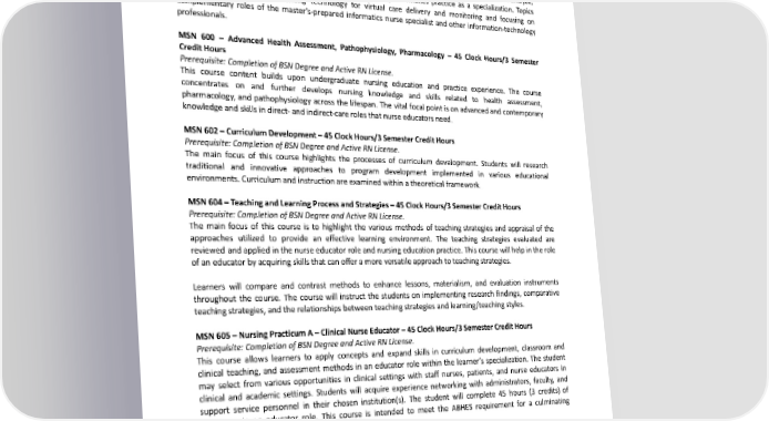 accountability in nursing care, and multidisciplinary communication. Complex ethical issues in management are discussed, the legal authority for nursing practice and the impact of legislative and political processes. MSN516–AdvancedHealthcareTechnology&Informatics–45ClockHours/3SemesterCreditHours Prerequisite: Completion of BSN Degree and Active RN License. This course presents the functions, roles, scope, and standards of practice to the learner. Students will analyze, explore, implement, and evaluate diverse aspects of nursing informatics practice as a specialization. Topics include utilizing and implementing technology for virtual care delivery and monitoring and focusing on complementary roles of the master’s-prepared informatics nurse specialist and other information-technology professionals. MSN 600 – Advanced Health Assessment, Pathophysiology, Pharmacology – 45 Clock Hours/3 Semester Credit Hours Prerequisite: Completion of BSN Degree and Active RN License. This course content builds upon undergraduate nursing education and practice experience. The course concentrates on and further develops nursing knowledge and skills related to health assessment, pharmacology, and pathophysiology across the lifespan. The vital focal point is on advanced and contemporary knowledgeandskillsindirect- and indirect-care roles that nurse educators need. MSN602–CurriculumDevelopment–45ClockHours/3SemesterCreditHours Prerequisite: Completion of BSN Degree and Active RN License. The main focus of this course highlights the processes of curriculum development. Students will research traditional and innovative approaches to program development implemented in various educational environments. Curriculum and instruction are examined within a theoretical framework. MSN604–TeachingandLearningProcessandStrategies–45ClockHours/3SemesterCreditHours Prerequisite: Completion of BSN Degree and Active RN License. The main focus of this course is to highlight the various methods of teaching strategies and appraisal of the approaches utilized to provide an effective learning environment. The teaching strategies evaluated are reviewed andappliedinthenurseeducatorroleandnursingeducationpractice.Thiscoursewillhelpintherole of an educator by acquiring skills that can offer a more versatile approach to teaching strategies. Learners will compare and contrast methods to enhance lessons, materialism, and evaluation instruments throughout the course. The course will instruct the students on implementing research findings, comparative teaching strategies, and the relationships between teaching strategies and learning/teaching styles. MSN605–NursingPracticumA–ClinicalNurseEducator–45ClockHours/3SemesterCreditHours Prerequisite: Completion of BSN Degree and Active RN License. This course allows learners to apply concepts and expand skills in curriculum development, classroom and clinical teaching, and assessment methods in an educator role within the learner’s specialization. The student may select from various opportunities in clinical settings with staff nurses, patients, and nurse educators in clinical and academic settings. Students will acquire experience networking with administrators, faculty, and support service personnel in their chosen institution(s). The student will complete 45 hours (3 credits) of practicum in an educator role. This course is intended to meet the ABHES requirement for a culminating assessment. MSN606–AssessmentandEvaluationofLearning–45ClockHours/3SemesterCreditHours Prerequisite: Completion of BSN Degree and Active RN License. This course assesses and examines the theory, logic, and practice of educational measurement. Comparisons are made between evaluation concepts and assessments, frameworks, and models. These will also be analyzed for relevancy and applicability in the curriculum development quality assurance processes. The practical application of measurement theory to constructing and utilizing educational evaluation instruments is 308