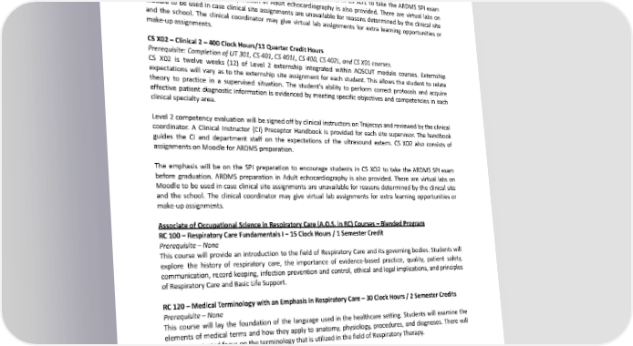 Level 1 competency evaluation will be signed off by clinical instructors on Trajecsys and reviewed by the clinical coordinator. A Clinical Instructor (CI) Preceptor Handbook is provided for each site supervisor. The handbook guides the CI and department staff on the expectations of the ultrasound extern. CS XO1 also consists of assignmentsonMoodleforARDMSpreparation. The emphasis will be on the SPI preparation to encourage students in CS XO1 to take the ARDMS SPI exam before graduation. ARDMS preparation in Adult echocardiography is also provided. There are virtual labs on Moodle to be used in case clinical site assignments are unavailable for reasons determined by the clinical site and the school. The clinical coordinator may give virtual lab assignments for extra learning opportunities or make-upassignments. CSX02–Clinical2–400ClockHours/13QuarterCreditHours Prerequisite: Completion of UT 301, CS 401, CS 401L, CS 400, CS 402L, and CS X01 courses. CS X02 is twelve weeks (12) of Level 2 externship integrated within AOSCUT module courses. Externship expectations will vary as to the externship site assignment for each student. This allows the student to relate theory to practice in a supervised situation. The student’s ability to perform correct protocols and acquire effective patient diagnostic information is evidenced by meeting specific objectives and competencies in each clinical specialty area. Level 2 competency evaluation will be signed off by clinical instructors on Trajecsys and reviewed by the clinical coordinator. A Clinical Instructor (CI) Preceptor Handbook is provided for each site supervisor. The handbook guides the CI and department staff on the expectations of the ultrasound extern. CS XO2 also consists of assignmentsonMoodleforARDMSpreparation. The emphasis will be on the SPI preparation to encourage students in CS XO2 to take the ARDMS SPI exam before graduation. ARDMS preparation in Adult echocardiography is also provided. There are virtual labs on Moodle to be used in case clinical site assignments are unavailable for reasons determined by the clinical site and the school. The clinical coordinator may give virtual lab assignments for extra learning opportunities or make-upassignments. Associate of Occupational Science in Respiratory Care (A.O.S. in RC) Courses – Blended Program RC100–RespiratoryCareFundamentalsI–15ClockHours/1SemesterCredit Prerequisite – None This course will provide an introduction to the field of Respiratory Care and its governing bodies. Students will explore the history of respiratory care, the importance of evidence-based practice, quality, patient safety, communication, record keeping, infection prevention and control, ethical and legal implications, and principles of Respiratory Care and Basic Life Support. RC120–MedicalTerminologywithanEmphasisinRespiratoryCare–30ClockHours/2SemesterCredits Prerequisite – None This course will lay the foundation of the language used in the healthcare setting. Students will examine the elements of medical terms and how they apply to anatomy, physiology, procedures, and diagnoses. There will beaconcentratedfocusontheterminologythatisutilizedinthefieldofRespiratoryTherapy. RC200–RespiratoryCareFundamentalsII–75ClockHours/4SemesterCredits Prerequisite – Completion of courses in preceding modules with a “C” or better. This hybrid course will provide students with a foundation in the many respiratory treatment modalities within the hospital setting. In the classroom, students will explore the topics of airway pharmacology, aerosol drug therapy, bland aerosol therapy, airway clearance therapy, lung expansion therapy, medical gasses and associated therapies, airway management, and emergency response. In the lab setting, students will apply skills learned using high-fidelity simulation. 256