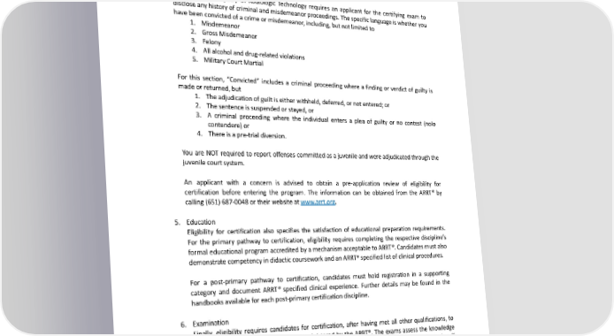 within California. Eligibility for ARRT® Certification Per ARRT®´s “Equation for Excellence,” candidates for ARRT® certification must meet basic requirements in the three componentsoftheequation: 4. Ethics ARRT®Pre-ApplicationReviewProcess The American Registry of Radiologic Technology requires an applicant for the certifying exam to disclose any history of criminal and misdemeanor proceedings. The specific language is whether you havebeenconvictedofacrimeormisdemeanor,including,butnotlimitedto 1. Misdemeanor 2. GrossMisdemeanor 3. Felony 4. All alcohol and drug-related violations 5. Military Court Martial For this section, “Convicted” includes a criminal proceeding where a finding or verdict of guilty is madeorreturned,but 1. Theadjudication of guilt is either withheld, deferred, or not entered; or 2. Thesentenceissuspendedorstayed,or 3. A criminal proceeding where the individual enters a plea of guilty or no contest (nolo contendere) or 4. Thereisapre-trial diversion. You are NOT required to report offenses committed as a juvenile and were adjudicated through the juvenile court system. An applicant with a concern is advised to obtain a pre-application review of eligibility for certification before entering the program. The information can be obtained from the ARRT® by calling (651) 687-0048 or their website at www.arrt.org. 5. Education Eligibility for certification also specifies the satisfaction of educational preparation requirements. For the primary pathway to certification, eligibility requires completing the respective discipline’s formal educational program accredited by a mechanism acceptable to ARRT®. Candidates must also demonstratecompetencyindidacticcourseworkandanARRT®specifiedlistofclinicalprocedures. For a post-primary pathway to certification, candidates must hold registration in a supporting category and document ARRT® specified clinical experience. Further details may be found in the handbooksavailableforeachpost-primarycertification discipline. 6. Examination Finally, eligibility requires candidates for certification, after having met all other qualifications, to pass an examination developed and administered by the ARRT®. The exams assess the knowledge and cognitive skills underlying the intelligent performance of the tasks typically required of staff technologists practicing within the respective disciplines. Exam content is specified on this website andintherespectivehandbookforeachdiscipline. California Department of Public Health, Radiologic Health Branch contact information is MS 7610, P.O. Box 997414, Certification Unit, Sacramento, CA 95899-7414, Phone: (916) 327-5106, Fax: (916) 440-7999, Web: 88