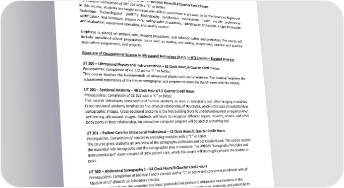equipmentoperation,andqualitycontrol. Emphasis is placed on digital imaging and radiographic, fluoroscopic, mobile, and tomographic equipment requirements and design, incorporating basic knowledge of quality control. This course will include outside-of-school preparation hours such as reading and writing assignments, practice and practical application assignments, and projects. XRT217–RadiologicTechnologySeminarII–80ClockHours/8.0QuarterCreditHours Prerequisite: Completion of XRT 216 with a “C” or better. In this course, students are taught concepts and skills to assist them in preparation for the American Registry of Radiologic Technologists® (ARRT®) Radiography certification examination. Topics include professional certification and licensure, patient care, radiographic procedures, radiographic protection, image production andevaluation, equipmentoperation,andqualitycontrol. Emphasis is placed on patient care, imaging procedures, and radiation safety and protection. This course will include outside-of-school preparation hours such as reading and writing assignments, practice and practical application assignments, and projects. Associate of Occupational Science in Ultrasound Technology (A.O.S. in UT) Courses – Blended Program UT200–UltrasoundPhysicsandInstrumentation–62ClockHours/6QuarterCreditHours Prerequisites: Completion of GE 112 with a “C” or better. This course teaches the fundamentals of ultrasound physics and instrumentation. The material heightens the educational experience of the future sonographer and prepares students for the SPI exam with the ARDMS. UT201–SectionalAnatomy–48ClockHours/4.5QuarterCreditHours Prerequisites: Completion of GE 021 with a “C” or better. This course introduces cross-sectional human anatomy as seen in sonograms and other imaging modalities. Cross-sectional anatomy emphasizes the physical relationship of structures, which is the basis of understanding sonographic images. Cross-sectional anatomy is the first building block to understanding what is required when performing ultrasound images. Students will learn to recognize different organs, muscles, vessels, and other bodypartsintheirrelationship. An interactive computer program will be used as a teaching tool. UT301–PatientCareforUltrasoundProfessional–12ClockHours/1QuarterCreditHours Prerequisites: Completion of courses in preceding modules with a “C” or better. Thecoursegivesstudentsanoverviewofthesonographyprofessionandbasicpatientcare.Thiscourseteaches theessential role sonography and the sonographer play in medicine. The ARDMS “Sonography Principles and Instrumentation” exam consists of 10% patient care, which this course will thoroughly prepare the student to pass. UT302–AbdominalSonography1–84ClockHours/8QuarterCreditHours Prerequisites: Completion of Module I and II courses with a “C” or better and concurrent enrollment with all ModuleIIIUTdidacticorlaboratorycourses. This course introduces the anatomy and basic protocols that pertain to ultrasound examinations of the abdominalorgans.Thiscourseestablishesfoundationsforscanningtechniques,protocols,andpatientbody habitus variations. Students learn the sonographer’s role in diagnosing diseases of the abdominal organs by understandingthecriteria for “normal.” UT302L–LaboratoryAbdominalSonography1–84ClockHours/4QuarterCreditHours Prerequisites: Completion of Module I and II courses with a “C” or better and concurrent enrollment with all ModuleIIIUTdidacticorlaboratorycourses. 264