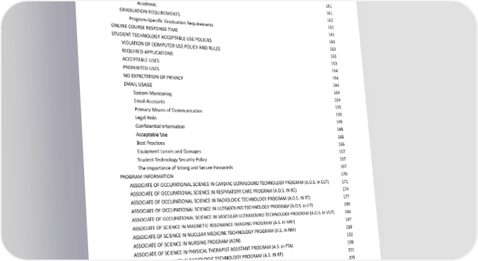 ATTENDANCE–ABSENT–TARDINESS–DROP 153 Make-upGuidelines 155 ACADEMICPROBATION/REMEDIATION 157 DISCIPLINARYPROBATION 160 REPETITIONOFCLASSESORMODULES 161 LEAVESOFABSENCE 161 Pregnancy 161 Academic 162 GRADUATIONREQUIREMENTS 162 Program-Specific Graduation Requirements 162 ONLINECOURSERESPONSETIME 163 STUDENTTECHNOLOGYACCEPTABLEUSEPOLICIES 163 VIOLATIONOFCOMPUTERUSEPOLICYANDRULES 163 REQUIREDAPPLICATIONS 163 ACCEPTABLEUSES 164 PROHIBITEDUSES 164 NOEXPECTATIONOFPRIVACY 164 EMAILUSAGE 164 SystemMonitoring 164 Email Accounts 165 PrimaryMeansofCommunication 165 Legal Risks 165 Confidential Information 165 Acceptable Use 165 Best Practices 166 EquipmentLossesandDamages 167 StudentTechnologySecurityPolicy 167 TheImportanceofStrongandSecurePasswords 167 PROGRAMINFORMATION 170 ASSOCIATEOFOCCUPATIONALSCIENCEINCARDIACULTRASOUNDTECHNOLOGYPROGRAM(A.O.S.inCUT) 171 ASSOCIATEOFOCCUPATIONALSCIENCEINRESPIRATORYCAREPROGRAM(A.O.S.INRC) 174 ASSOCIATEOFOCCUPATIONALSCIENCEINRADIOLOGICTECHNOLOGYPROGRAM(A.O.S.INRT) 177 ASSOCIATEOFOCCUPATIONALSCIENCEINULTRASOUNDTECHNOLOGYPROGRAM(A.O.S.inUT) 180 ASSOCIATEOFOCCUPATIONALSCIENCEINVASCULARULTRASOUNDTECHNOLOGYPROGRAM(A.O.S.inVUT) 184 ASSOCIATEOFSCIENCEINMAGNETICRESONANCEIMAGINGPROGRAM(A.S.inMRI) 187 ASSOCIATEOFSCIENCEINNUCLEARMEDICINETECHNOLOGYPROGRAM(A.S.inNM) 189 ASSOCIATEOFSCIENCEINNURSINGPROGRAM(ADN) 192 ASSOCIATEOFSCIENCEINPHYSICALTHERAPISTASSISTANTPROGRAM(A.S.inPTA) 198 ASSOCIATEOFSCIENCEINRADIOLOGICTECHNOLOGYPROGRAM(A.S.INRT) 201 ASSOCIATEOFSCIENCEINVOCATIONALNURSINGPROGRAM(A.S.inVN) 205 BACHELOROFSCIENCEINDIAGNOSTICMEDICALIMAGINGPROGRAM(B.S.inDMI) 206 BACHELOROFSCIENCEINNURSINGPROGRAM(BSN) 209 BACHELOROFSCIENCEINRADIATIONTHERAPY(B.S.inRT) 218 BONEDENSITOMETRYTECHNICIANPROGRAM(DXA) 221 DENTALASSISTANTPROGRAM(DA) 222 MASTEROFSCIENCEINNURSINGPROGRAM(BSNtoMSN) 224 8
