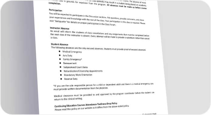 For fully asynchronous Online classes, students must complete the lecture discussions, both responding to the prompt and responding to others. A student who does not make the minimum number of posts in the discussion for each lecture will be marked absent. Absences are made up by completing the discussion requirements. The learning management system tracks asynchronous hours through an activity log. The log records a student’s time on a particular page or activity and can be pulled at any time for review. The absence of more than 10% of the course (more than two (2) class periods) may result in a student being placed on academic probation and is grounds for expulsion from the program. All absences must be made up before course completion. Participation Youwill be expected to participate in the Discussion sections. Ask questions, provide comments, and share yourexperiencesandknowledgewiththerestoftheclass.Yourparticipationinthisclassisrequired.Please visit “Netiquette” for details on proper participation in the Class Forum. Instructor Absence An email will inform the students of class cancellations and any assignments that must be completed before the next class if the instructor is absent. Every attempt will be made to provide a substitute rather than cancel aclass. StudentAbsence Thefollowingabsencesaretheonlyexcusedabsences.Studentsmustprovideproofofexcusedabsences: ● MedicalEmergency ● JuryDuty ● FamilyEmergency* ● Bereavement ● SubpoenaedCourtDates ● Naturalization/Citizenship Appointments ● MandatoryWorkOrientation ● ReserveDuty *If you are the sole responsible person for a child or dependent adult and there is a medical emergency, you mustprovidewrittendocumentationfromthephysician. Medical clearance must be provided to and approved by the program coordinator before the student can return to the clinical setting. ContinuingEducationCoursesAttendance-Tardiness-DropPolicy Please read this policy on our website as it differs from the above-stated policy. Make-upGuidelines The table Make-upAssignmentsDeadlinessummarizesthemake-upguidelinesperprogram.Allabsencesmust be made up within the period specified in the table or by the end of the course, whichever comes first. The student’s responsibility is to ensure that a make-up plan of action for each absence is completed within the period specified in the table and documented on the didactic make-up and clinical make-up form. All make-up forms must be wholly and accurately completed with all required signatures for all missed hours before the credit for make-up hours is granted. 155