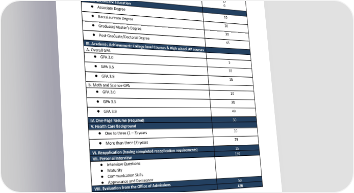 5 ● Anatomy&PhysiologyAssessmentTest(68-50) ● Anatomy&PhysiologyAssessmentTest(49andlower) UCAT ● 35orgreater 35 25 ● 30-34 15 ● 25-29 0 ● 24orless II. Post-Secondary Education 10 ● AssociateDegree 20 ● BaccalaureateDegree 30 ● Graduate/Master’sDegree 45 ● Post-Graduate/DoctoralDegree III. Academic Achievement: College level Courses & High school AP courses A. Overall GPA 5 ● GPA3.0 10 ● GPA3.5 15 ● GPA3.9 B. MathandScienceGPA 20 ● GPA3.0 30 ● GPA3.5 40 ● GPA3.9 IV. One-Page Resume(required) 30 V. Health Care Background 10 ● Onetothree(1–3)years 25 ● Morethanthree(3)years VI. Reapplication (having completed reapplication requirements) 15 VII. Personal Interview 150 ● InterviewQuestions ● Maturity ● CommunicationSkills ● AppearanceandDemeanor VIII. Evaluation from the Office of Admissions 50 Possible Total Points: 430 Associate of Science in Magnetic Resonance Imaging Program (A.S. in MRI) Applicants must: 1. AttendorviewaliveorrecordedInformationSession. 2. Submit original transcripts from the Registrar at an educational institution for applicants requesting credit granting for General Education Courses. Copies are not accepted. All coursework must be completed and given a g rade of at least a “C.” Anatomy and Physiology I with Laboratory must be 34