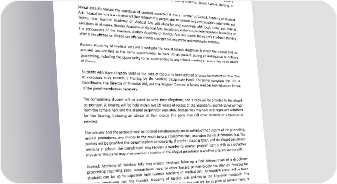 respect for the individual is vital. Gurnick Academy of Medical Arts does not tolerate sexual assault in any form. The definition of “sexual assault” includes but is not limited to sexual battery, the threat of a sexual assault, and rape, including but not limited to forced oral copulation, foreign object, or sodomy. Statement of the StandardofEvidence:GurnickAcademyofMedicalArtsusesapreponderanceoftheevidencestandard. Sanctions Gurnick Academy of Medical Arts May Impose Following a Final Institutional Disciplinary Determination of Rape, Acquaintance Rape, Domestic Violence, Dating Violence, Sexual Assault, Stalking, or OtherSexualOffense: Sexual assaults violate the standards of conduct expected of every member of Gurnick Academy of Medical Arts. Sexual assault is a criminal act that subjects the perpetrator to criminal and civil penalties under state and federal law. Gurnick Academy of Medical Arts will abide by and cooperate with local, state, and federal sanctions in all cases. Gurnick Academy of Medical Arts disciplinary action may include expulsion depending on the seriousness of the situation. Gurnick Academy of Medical Arts will review the victim’s academic standing after a sex offense or alleged sex offense if those changes are requested and reasonably available. Gurnick Academy of Medical Arts will investigate the sexual assault allegations in which the accuser and the accused are entitled to the same opportunities to have others present during an institutional disciplinary proceeding, including the opportunity to be accompanied to any related meeting or proceeding by an advisor of choice. Students who have allegedly violated the code of conduct or been accused of sexual harassment or other Title IX violations may request a hearing by the Student Disciplinary Panel. The panel comprises the Title IX Coordinator, the Director of Financial Aid, and the Program Director. A faculty member may substitute for one of the panel members as necessary. The complaining student will be asked to write their allegations, and a copy will be provided to the alleged perpetrator. A hearing will be held within two (2) weeks of receipt of the allegations, and the panel will hear fromthecomplainantandtheallegedperpetratorseparately.Bothpartiesmayhaveanyonepresentwiththem for the hearing, including an advisor of their choice. The panel may call other students or employees as needed. The accuser and the accused must be notified simultaneously and in writing of the outcome of the proceeding, appeal procedures, any change to the result before it becomes final, and when the result becomes final. The parties will be provided the determinations concurrently. If another action is taken, and the alleged perpetrator remains in school, the complainant may request a transfer to another program start or shift as a protective measure.Thepanelmayalsoconsideratransferoftheallegedperpetratortoanotherprogramstartorshift. Gurnick Academy of Medical Arts may impose sanctions following a final determination of a disciplinary proceeding regarding rape, acquaintance rape, or other forcible or non-forcible sex offenses. Penalties for students can be up to expulsion from Gurnick Academy of Medical Arts. Appropriate action will be taken against employees per the Gurnick Academy of Medical Arts policies in the Employee Handbook. The disciplinary action imposed by Gurnick Academy of Medical Arts will not be in place of penalty, fines, or imprisonmentimposedbythelegalsystem. The victim’s confidentiality will be protected, including record-keeping that excludes personally identifiable information on victims. Gurnick Academy of Medical Arts will take all reasonable steps to investigate and respond to the complaint commensurate with the complainant’s request for confidentiality or termination of investigative pursuit. 116