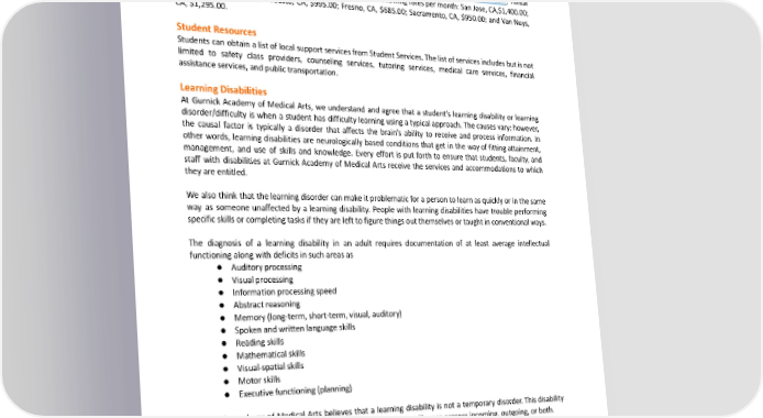 “get your foot in the door” approach by maintaining flexibility regarding salary, hours, location, and potential relocation to secure such employment. Housing Gurnick Academy of MedicalArtsdoesnotassumeresponsibilityforstudenthousing,doesnothavedormitory facilities under its control, nor offers student housing assistance. According to www.rentals.com, rental properties in the following cities start at approximately the following rates per month: San Jose, CA,$1,400.00; Concord, CA, $1700.00; Modesto, CA, $995.00; Fresno, CA, $685.00; Sacramento, CA, $950.00; and Van Nuys, CA,$1,295.00. StudentResources Students can obtain a list of local support services from Student Services. The list of services includes but is not limited to safety class providers, counseling services, tutoring services, medical care services, financial assistance services, and public transportation. Learning Disabilities At Gurnick Academy of Medical Arts, we understand and agree that a student’s learning disability or learning disorder/difficulty is when a student has difficulty learning using a typical approach. The causes vary; however, the causal factor is typically a disorder that affects the brain’s ability to receive and process information. In other words, learning disabilities are neurologically based conditions that get in the way of fitting attainment, management, and use of skills and knowledge. Every effort is put forth to ensure that students, faculty, and staff with disabilities at Gurnick Academy of Medical Arts receive the services and accommodations to which they are entitled. Wealso think that the learning disorder can make it problematic for a person to learn as quickly or in the same way as someone unaffected by a learning disability. People with learning disabilities have trouble performing specific skills or completing tasks if they are left to figure things out themselves or taught in conventional ways. The diagnosis of a learning disability in an adult requires documentation of at least average intellectual functioning along with deficits in such areas as ● Auditoryprocessing ● Visualprocessing ● Informationprocessingspeed ● Abstractreasoning ● Memory(long-term,short-term,visual,auditory) ● Spokenandwrittenlanguageskills ● Readingskills ● Mathematicalskills ● Visual-spatial skills ● Motorskills ● Executivefunctioning(planning) Gurnick Academy of Medical Arts believes that a learning disability is not a temporary disorder. This disability typeimpactshowstudentswithaverageorabove-averageintelligenceprocessincoming,outgoing,orboth. Learning disabilities are often inconsistent. They may be manifested in only one specific academic area, such as math or foreign language. There might be problems in grade school, none in high school, and a return during higher education. Learning disabilities are not the same as mental retardation or emotional disorders. Prevailing accommodations for students with learning disabilities are alternative print formats, taped lectures, 143