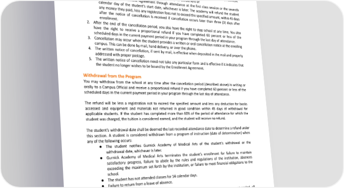 REFUND Student’s Right to Cancel 1. Youareentitledtocancelyourinstructionprogramwithoutpenaltyorobligation. a. A full refund of all tuition and fees paid will be made if a student cancels their Enrollment Agreementbynotifyingtheschoolwithinthreedaysofenrollmentor b. Cancels their Enrollment Agreement through attendance at the first class session or the seventh calendar day of the student’s start date, whichever is later. The academy will refund the student any money they paid, less any registration fees not to exceed the specified amount, within 45 days after the notice of cancellation is received if cancellation occurs later than three (3) days after enrollment. 2. After the end of the cancellation period, you also have the right to stop school at any time. You also have the right to receive a proportional refund if you have completed 60 percent or less of the scheduleddaysinthecurrentpaymentperiodinyourprogramthroughthelastdayofattendance. 3. Cancellation may occur when the student provides a written or oral cancellation notice at the enrolling campus.Thiscanbedonebymail,handdelivery,oroverthephone. 4. The written notice of cancellation, if sent by mail, is effective when deposited in the mail and properly addressedwithproperpostage. 5. The written notice of cancellation need not take any particular form and is effective if it indicates that thestudentnolongerwishestobeboundbytheEnrollmentAgreement. WithdrawalfromtheProgram You may withdraw from the school at any time after the cancellation period (described above) in writing or orally to a Campus Official and receive a proportional refund if you have completed 60 percent or less of the scheduleddaysinthecurrentpaymentperiodinyourprogramthroughthelastdayofattendance. The refund will be less a registration not to exceed the specified amount and less any deduction for books accessed and equipment and materials not returned in good condition within 45 days of withdrawal for applicable students. If the student has completed more than 60% of the period of attendance for which the student was charged, the tuition is considered earned, and the student will receive no refund. The student’s withdrawal date shall be deemed the last recorded attendance date to determine a refund under this section. A student is considered withdrawn from a program of instruction (date of determination) when anyofthefollowingoccurs: ● The student notifies Gurnick Academy of Medical Arts of the student’s withdrawal or the withdrawaldate,whicheverislater. ● Gurnick Academy of Medical Arts terminates the student’s enrollment for failure to maintain satisfactory progress, failure to abide by the rules and regulations of the institution, absences exceeding the maximum set forth by the institution, or failure to meet financial obligations to the school. ● Thestudenthasnotattendedclassesfor14calendardays. ● Failuretoreturnfromaleaveofabsence. For programs beyond the current “payment period,” if you withdraw before the next payment period, all charges collected for the next period will be refunded. Tuition paid from the proceeds of a loan or third party should be refunded to the lender, third party, or the state or federal agency that guaranteed or reinsured the loan. Any amount of the refund over the unpaid balance of the loan shall be first used to repay any student financial aid programs from which the student received benefits proportionately to the amount received. Any remainingamountshallbepaidtothestudent. 96