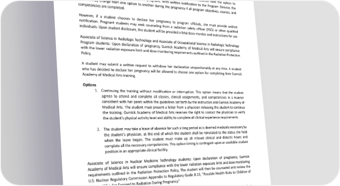 neurological abnormalities, and developmental difficulties. PREGNANCY Gurnick Academy of Medical Arts provides students with a safe environment for clinical experiences and training. In compliance with regulations regarding pregnant students, female students have the option to inform program officials whether they are pregnant. With written notification to the Program Director, the student may change from one option to another during the pregnancy if all program objectives, courses, and competenciesarecompleted. However, if a student chooses to declare her pregnancy to program officials, she must provide written notification. Pregnant students may seek counseling from a radiation safety officer (RSO) or other qualified individuals. Upon student disclosure, the student will be provided a fetal dose monitor and instructions for use. Associate of Science in Radiologic Technology and Associate of Occupational Science in Radiologic Technology Program students: Upon declaration of pregnancy, Gurnick Academy of Medical Arts will ensure compliance with the lower radiation exposure limit and dose monitoring requirements outlined in the Radiation Protection Policy. A student may submit a written request to withdraw her declaration unquestionably at any time. A student whohas decided to declare her pregnancy will be allowed to choose one option for completing their Gurnick AcademyofMedicalArtstraining. Options 1. Continuing the training without modification or interruption. This option means that the student agrees to attend and complete all classes, clinical assignments, and competencies in a manner consistent with her peers within the guidelines set forth by the instructors and Gurnick Academy of Medical Arts. The student must present a letter from a physician releasing the student to continue the training. Gurnick Academy of Medical Arts reserves the right to contact the physician to verify thestudent’s physical activity level and ability to complete all clinical experience requirements. 2. The student maytakealeaveofabsenceforsuchalongperiodasisdeemedmedicallynecessaryby the student’s physician, at the end of which the student shall be reinstated to the status she held when the leave began. The student must make up all missed clinical and didactic hours and completeallthenecessarycompetencies.Thisoptiontimingiscontingentuponanavailablestudent position in an appropriate clinical facility. Associate of Science in Nuclear Medicine Technology students: Upon declaration of pregnancy, Gurnick Academy of Medical Arts will ensure compliance with the lower radiation exposure limit and dose monitoring requirements outlined in the Radiation Protection Policy. The student will then be counseled and review the U.S. Nuclear Regulatory Commission Appendix to Regulatory Guide 8.13, “Possible Health Risks to Children of WomenWhoAreExposedtoRadiationDuringPregnancy.” A student may submit a written request to withdraw her declaration unquestionably at any time. A student who has chosen to declare her pregnancy will be allowed to choose one of the following options for completingtheGurnickAcademyofMedicalArtstraining. Options 1. Continuing the training with approval of the clinical site per the institution’s radiation protection policy. As a result, the student elects to continue doing so at their risk. Neither the college nor the 130
