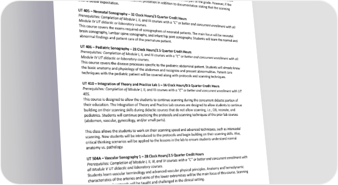 disease processes of each organ will be covered with the instruction on identifying and presenting suspected diseases using other diagnostic tools such as patient history, lab results, and correlation with other modalities. Doppleroftheabdominalvesselswillbetaughtasatooltodiscoverandprovethediseaseprocessesofcertain organs. Mid-moduleassessmentswillbeconductedinthiscourse.Mid-moduleassessmentsaredonetoverify if the student is at the scanning level expected at this stage of the course. Different groups have different levels of expectations depending on start dates. Mid-module assessments are not part of the grade. However, if the student fails, they will be put on academic probation in addition to documentation stating that the scanning level is below expectation. UT405–NeonatalSonography–32ClockHours/3QuarterCreditHours Prerequisites: Completion of Module I, II, and III courses with a “C” or better and concurrent enrollment with all ModuleIVUTdidacticorlaboratorycourses. This course covers the exams required of sonographers of neonatal patients. The main focus will be neonatal brain sonography, lumbar spine sonography, and infant hip joint sonography. Students will learn the normal and abnormalfindingsandpatientcareoftheprematurepatient. UT406–PediatricSonography–28ClockHours/2.5QuarterCreditHours Prerequisites: Completion of Module I, II, and III courses with a “C” or better and concurrent enrollment with all ModuleIVUTdidacticorlaboratorycourses. This course covers the disease processes specific to the pediatric abdominal patient. Students will already know thebasicanatomyandphysiologyoftheabdomenandrecognizeandpresentabnormalities.Patientcare techniques with the pediatric patient will be covered along with protocols and scanning techniques. UT410–IntegrationofTheoryandPracticeLab1–16ClockHours/0.5QuarterCreditHours Prerequisites: Completion of Module I, II, and III courses with a “C” or better and concurrent enrollment with UT 405. This course is designed to allow the students to continue scanning during the concurrent didactic portion of their education. The Integration of Theory and Practice Lab courses are designed to allow students to continue building on their scanning skills during didactic courses that do not allow scanning, i.e., OB, neonate, and pediatrics. Students will continue practicing the protocols and scanning techniques of the prior lab courses (abdomen,vascular,gynecology,and/orsmallparts). This class allows the students to work on their scanning speed and advanced techniques, such as intercostal scanning. Newstudentswill be introduced to the protocols and begin building on their scanning skills. Also, critical thinking scenarios will be applied to the lessons in the lab to ensure students understand normal anatomyvs.pathology. UT504A–VascularSonography1–28ClockHours/2.5QuarterCreditHours Prerequisites: Completion of Module I, II, III, and IV courses with a “C” or better and concurrent enrollment with all Module V UT didactic and laboratory courses. Students learn vascular terminology and advanced vascular physical principles. Anatomy and hemodynamic characteristics of the arteries and veins of the lower extremities will be the main focus of this course. Scanning techniques and protocols will be taught and challenged in the clinical setting. UT504AL–LaboratoryVascularSonography1–28ClockHours/1QuarterCreditHour Prerequisites: Completion of Module I, II, III, and IV courses with a “C” or better and concurrent enrollment with all Module V UT didactic and laboratory courses. This course will review Doppler sonography within the lab setting. Students will learn techniques and skills for theoptimization of the vascular examination. Laboratory Vascular 1 focuses on the lower extremity venous systemprotocols. This will introduce and prepare students for studies for deep vein thrombosis disease. 266