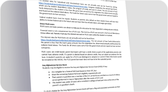 Direct Subsidized and Unsubsidized Loans There are two types of Direct Loans: Subsidized and Unsubsidized. Students must have financial need to receive a Subsidized Direct Loan. The federal government pays the interest that accrues during specific Subsidized Loan periods, including while the student is in school or has an approved deferment status. Financial need is not a requirement for an Unsubsidized Direct Loan. Students must pay the interest that accrues on Unsubsidized Direct Loans while in school or choose to capitalize the interest (add it to the loan principal). The interest rates for Subsidized and Unsubsidized loans are set annually and can be found by visiting https://studentaid.gov/understand-aid/types/loans/interest-rates. Congress establishes the annual loan limits, which vary by student dependency status, the program of study, and year in school. The net amount of loan funds disbursed to the student is less than the gross loan amount by the origination fee, determined annually and foundonthewebsitelistedabove.ThefundsforDirectLoanscomefromthegovernmentandarerepaidto thegovernmentvialoanservicers. Federal student loans must be repaid. Students or parents who default on their student loans will lose their ability to receive federal aid in the future and can have their tax refunds taken, and wages garnished. Direct PLUS Loans PLUSLoansareloansparentscanobtaintohelppayforeducationfortheirdependentundergraduatechildren. Financial need is not a requirement for a PLUS Loan. The limit to a PLUS Loan amount is the Cost of Attendance minusotheraid.ParentsmustpaytheinterestaccruedonPLUSLoanswhilethestudentisinschool. Theinterest rates for PLUS loans are set annually and can be found here: https://studentaid.gov/understand-aid/types/loans/interest-rates. The net amount of loan funds disbursed to the parent is less than the loan’s gross amount, less the origination fee, determined annually and found at the website listed above. The funds for all Direct Loans come from the government and are repaid via loan servicer companies. PLUS Loans are credit-based; parent borrowers will have a credit check as part of the application process and cannot have adverse credit. If a parent is denied based on adverse credit, they can obtain an endorser for the loan. A student’s parents can apply for a PLUS Loan (biological or adoptive or current if their information would beincludedontheFAFSA).ThePLUSparentborrowerdoesnothavetobethecustodialparent. Iraq Afghanistan Service Grant Students maybeeligible to receive the Iraq and Afghanistan Service Grant (IASG) if they: ● AreineligibleforaFederalPellGrant basedontheirEFC,but ● MeettheremainingFederalPellGranteligibilityrequirementsand ● TheirparentorguardianwasamemberoftheU.S.armedforcesanddiedasaresultofmilitary service performed in Iraq or Afghanistan after the events of 9/11 and ● Thestudentwasunder24yearsoldorenrolledincollegeatleastpart-timeatthetimeofthe parent’s or guardian’s death. Students eligible for the Iraq Afghanistan Service Grant will have a flag and associated comments on their StudentAidReport. IASGawardsaregiftaidandarenotrepaid. Children of Fallen Heroes Scholarship APell-eligible student whose parent or guardian died in the line of duty while performing as a public safety officer is eligible for the Children of Fallen Heroes (CFH) award. The CFH award is a maximum Pell Award, and all other need-basedaidisawardedusinga0EFC(maximumeligibility).Thestudentmust: 101