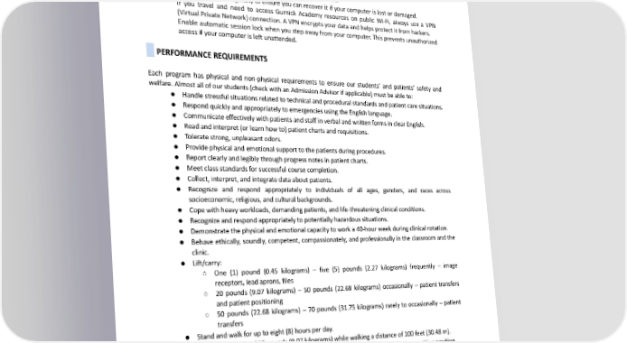 SecureWi-Fi WhenaccessingGurnickAcademyresources,onlyusesecureWi-Finetworks. AvoidusingpublicWi-Finetworks,astheyarelesssecureandmoreexposedtohacking. Additional Security Tips Becautiousaboutclickingonlinksoropeningattachmentsfromunknownsenders. KeepyourGurnickAcademycredentialsprivatefromothers. Backupyourdataregularlytoensureyoucanrecoveritifyourcomputerislostordamaged. If you travel and need to access Gurnick Academy resources on public Wi-Fi, always use a VPN (Virtual Private Network) connection. A VPN encrypts your data and helps protect it from hackers. Enable automatic session lock when you step away from your computer. This prevents unauthorized access if your computer is left unattended. PERFORMANCEREQUIREMENTS Each program has physical and non-physical requirements to ensure our students’ and patients’ safety and welfare. Almost all of our students (check with an Admission Advisor if applicable) must be able to: ● Handlestressfulsituationsrelatedtotechnicalandproceduralstandardsandpatientcaresituations. ● RespondquicklyandappropriatelytoemergenciesusingtheEnglishlanguage. ● CommunicateeffectivelywithpatientsandstaffinverbalandwrittenformsinclearEnglish. ● Readandinterpret(orlearnhowto)patientchartsandrequisitions. ● Toleratestrong,unpleasantodors. ● Providephysicalandemotionalsupporttothepatientsduringprocedures. ● Reportclearlyandlegiblythroughprogressnotesinpatientcharts. ● Meetclassstandardsforsuccessfulcoursecompletion. ● Collect,interpret, and integrate data about patients. ● Recognize and respond appropriately to individuals of all ages, genders, and races across socioeconomic, religious, and cultural backgrounds. ● Copewithheavyworkloads,demandingpatients,andlife-threateningclinicalconditions. ● Recognizeandrespondappropriatelytopotentiallyhazardoussituations. ● Demonstratethephysicalandemotionalcapacitytoworka40-hourweekduringclinicalrotation. ● Behave ethically, soundly, competent, compassionately, and professionally in the classroom and the clinic. ● Lift/carry: ○ One (1) pound (0.45 kilograms) – five (5) pounds (2.27 kilograms) frequently – image receptors, lead aprons, files ○ 20 pounds (9.07 kilograms) – 50 pounds (22.68 kilograms) occasionally – patient transfers andpatientpositioning ○ 50 pounds (22.68 kilograms) – 70 pounds (31.75 kilograms) rarely to occasionally – patient transfers ● Standandwalkforuptoeight(8)hoursperday. ● Carryaminimumof20pounds(9.07kilograms)whilewalkingadistanceof100feet(30.48m). ● Bendorflextheuppertrunkforwardto45degreesandthelowertorsointoasquattingposition. ● Rotatetheuppertrunkto30degreestotherightandleft. ● Reachatleast72inches(1.83m)abovefloorlevelorarm’sreach. ● Utilizethesenseofhearingtocommunicateeffectivelywiththepatientsandhealthcareteam. ● Utilize the sense of vision in all hospital lighting levels, varying from low illumination to bright light levels. ● Sitinclassforuptosix(6)hoursperday. 59