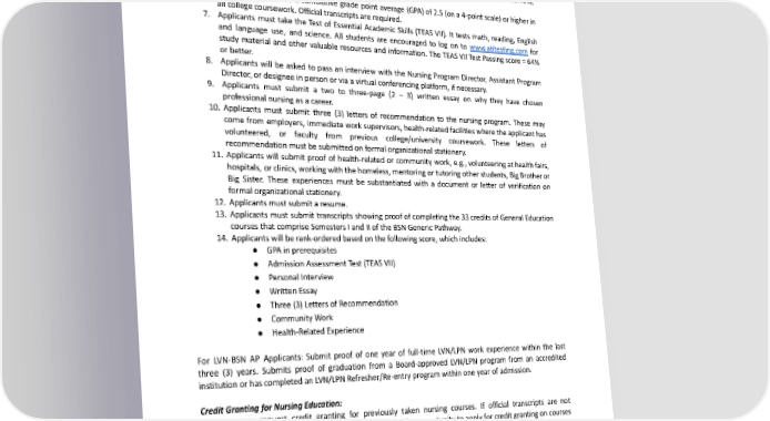 3. Applicants must submit a completed application. It is recommended that interested applicants fill outtheapplicationwiththeadmissionadvisor. 4. Applicants must complete all prerequisites to the BSN program. 5. Completing the Distance Education Questionnaire for applicants who receive full credit granting of the LVN to BSN or RN to BSN Advanced Placement General Education courses or enrollment and completing an online general education prerequisite course(s) at Gurnick Academy of Medical Arts, as applicable. 6. Applicants must have a cumulative grade point average (GPA) of 2.5 (on a 4-point scale) or higher in all college coursework. Official transcripts are required. 7. Applicants must take the Test of Essential Academic Skills (TEAS VII). It tests math, reading, English and language use, and science. All students are encouraged to log on to www.atitesting.com for study material and other valuable resources and information. The TEAS VII Test Passing score = 64% or better. 8. Applicants will be asked to pass an interview with the Nursing Program Director, Assistant Program Director, or designee in person or via a virtual conferencing platform, if necessary. 9. Applicants must submit a two to three-page (2 – 3) written essay on why they have chosen professional nursing as a career. 10. Applicants must submit three (3) letters of recommendation to the nursing program. These may come from employers, immediateworksupervisors,health-relatedfacilities where the applicant has volunteered, or faculty from previous college/university coursework. These letters of recommendationmustbesubmittedonformalorganizationalstationery. 11. Applicants will submit proof of health-related or community work, e.g., volunteering at health fairs, hospitals, or clinics, working with the homeless, mentoring or tutoring other students, Big Brother or Big Sister. These experiences must be substantiated with a document or letter of verification on formal organizational stationery. 12. Applicants must submit a resume. 13. Applicants must submit transcripts showing proof of completing the 33 credits of General Education courses that comprise Semesters I and II of the BSN Generic Pathway. 14. Applicants will be rank-ordered based on the following score, which includes: ● GPAinprerequisites ● AdmissionAssessmentTest(TEASVII) ● PersonalInterview ● WrittenEssay ● Three(3)LettersofRecommendation ● CommunityWork ● Health-RelatedExperience For LVN-BSN AP Applicants: Submit proof of one year of full-time LVN/LPN work experience within the last three (3) years. Submits proof of graduation from a Board-approved LVN/LPN program from an accredited institution or has completed an LVN/LPN Refresher/Re-entry program within one year of admission. Credit Granting for Nursing Education: Students may request credit granting for previously taken nursing courses. If official transcripts are not submitted at the time of the application, students forfeit the opportunity to apply for credit granting on courses taken previously. LVNs can transfer 24 Semester Credit Hours of courses taken at the post-secondary level to an institution accredited by an agency recognized by the United States Department Of Education or the Council of Higher Education Accreditation. Thecontentofthese24transfercreditsshallincludethefollowing: 47