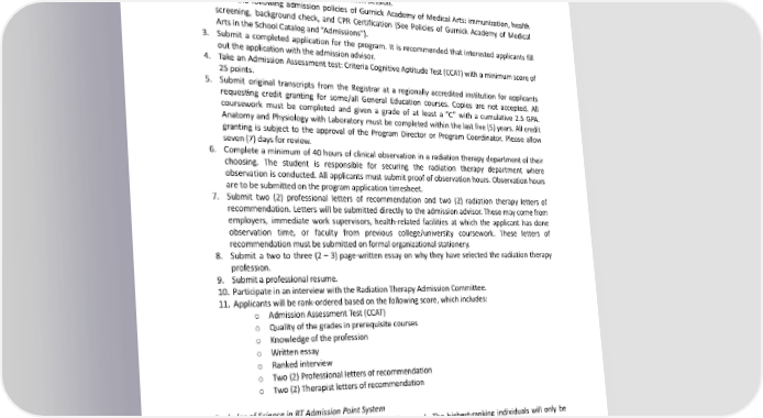 ● Compliancewiththerequirements 1 ● Self-Motivation 1 Total Possible Points for Criterion I through Criterion VII: 130 Points BachelorofScienceinRadiationTherapyProgram(B.S.inRT) Applicants Must: 1. AttendorviewaliveorrecordedInformationSession. 2. Meet the following admission policies of Gurnick Academy of Medical Arts: immunization, health screening, background check, and CPR Certification (See Policies of Gurnick Academy of Medical Arts in the School Catalog and “Admissions”). 3. Submit a completed application for the program. It is recommended that interested applicants fill outtheapplicationwiththeadmissionadvisor. 4. Take an Admission Assessment test: Criteria Cognitive Aptitude Test (CCAT) with a minimum score of 25points. 5. Submit original transcripts from the Registrar at a regionally accredited institution for applicants requesting credit granting for some/all General Education courses. Copies are not accepted. All coursework must be completed and given a grade of at least a “C” with a cumulative 2.5 GPA. Anatomy and Physiology with Laboratory must be completed within the last five (5) years. All credit granting is subject to the approval of the Program Director or Program Coordinator. Please allow seven(7)daysforreview. 6. Complete a minimum of 40 hours of clinical observation in a radiation therapy department of their choosing. The student is responsible for securing the radiation therapy department where observation is conducted. All applicants must submit proof of observation hours. Observation hours are to be submitted on the program application timesheet. 7. Submit two (2) professional letters of recommendation and two (2) radiation therapy letters of recommendation. Letters will be submitted directly to the admission advisor. These may come from employers, immediate work supervisors, health-related facilities at which the applicant has done observation time, or faculty from previous college/university coursework. These letters of recommendationmustbesubmittedonformalorganizationalstationery. 8. Submit a two to three (2 – 3) page-written essay on why they have selected the radiation therapy profession. 9. Submitaprofessionalresume. 10. Participate in an interview with the Radiation Therapy Admission Committee. 11. Applicants will be rank-ordered based on the following score, which includes: o AdmissionAssessmentTest(CCAT) o Qualityofthegradesinprerequisitecourses o Knowledgeoftheprofession o Writtenessay o Rankedinterview o Two(2)Professionallettersofrecommendation o Two(2)Therapistlettersofrecommendation Bachelor of Science in RT Admission Point System Applicants will be accepted to the program based on rank. The highest-ranking individuals will only be accepted. Students will be accepted based on geographic regions. Students may prefer the geographic area where they are accepted; however, they will be accepted based on rank. Students unwilling to relocate to the geographic region they are accepted in will not be allowed to join the program. Geographic change requests will not be considered. Table 15. B.S. in RT Admission Point System 50