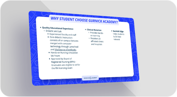 WHY STUDENT CHOOSE GURNICK ACADEMY? Quality Educational Experience Clinical Rotation Gurnick Edge Didactic and Lab Provides hands- helps students Experienced faculty and staff on learning build their Core didactic instruction Rotations at network consists of on campus lectures affiliated clinics merged with computer and hospitals technology through Lanschool and VitalSource eTextBooks Hands-on Nursing simulation lab hours Approved by Board of Registered Nursing (BRN) - Graduates are eligible to sit for the RN licensing exam