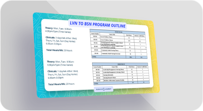 LVN TO BSN PROGRAM OUTLINE Theory: Mon, Tues 8:30am- 4:30pm/5pm (Time Varies) Clinicals: 3 days/wk either: Wed, Thurs, Fri, Sat, Sun (Day Varies) 6:30am-3:30pm Total Hours/Wk: 30 hours Theory: Mon, Tues 8:30am- 4:30pm/5pm (Time Varies) Clinicals: 1 day/wk either: Wed, Thurs, Fri, Sat, Sun (Day Varies) 6:30am-3:30pm Total Hours/Wk: 20 hours