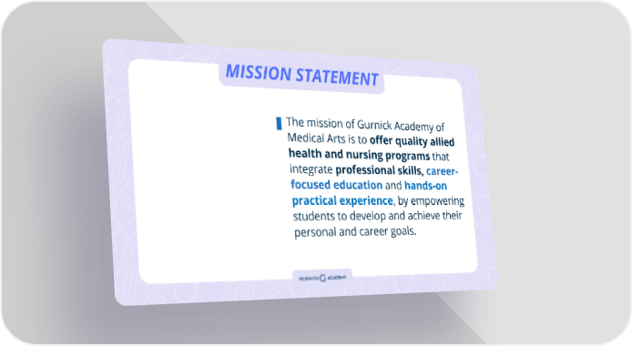 MISSION STATEMENT The mission of Gurnick Academy of Medical Arts is to offer quality allied health and nursing programs that integrate professional skills, career- focused education and hands-on practical experience, by empowering students to develop and achieve their personal and career goals.