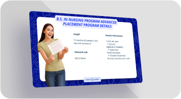 B.S. IN NURSING PROGRAM ADVANCED PLACEMENT PROGRAM DETAILS Length Session Information 15 months (63 weeks/1,455 1 start per year: hours/4 semesters) January Application Deadline: September Clinical & Lab Panel Interviews: October-November 652.5 hours 28 seats available each start