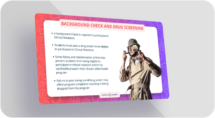 BACKGROUND CHECK AND DRUG SCREENING A background Check is required to participate in Clinical Rotations Students must pass a drug screen to be eligible to participate in Clinical Rotations Some felony and misdemeanor crimes may prevent students from being eligible to participate in clinical rotations and/or be certified/licensed in their chosen allied health program Failure to pass background/drug screen may affect program completion resulting in being dropped from the program