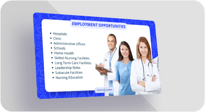 EMPLOYMENT OPPORTUNITIES Hospitals Clinic Administrative offices Schools Home Health Skilled Nursing Facilities Long Term Care Facilities Leadership Roles Subacute Facilities Nursing Education